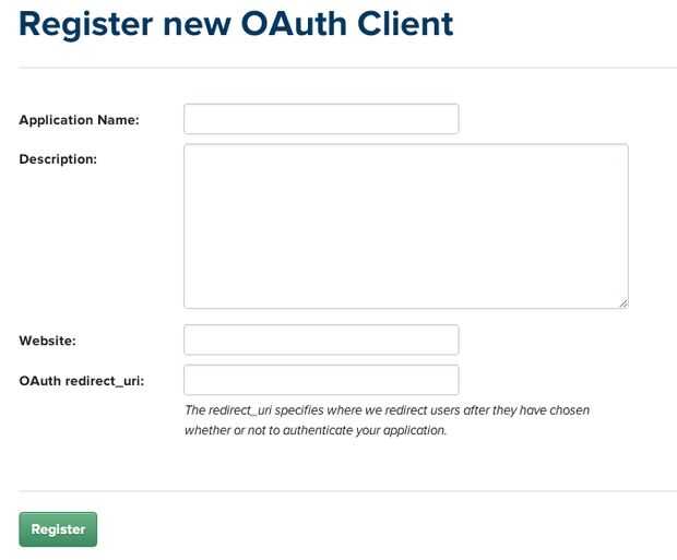 -el nombre de la aplicación y la descripción pueden ser lo que quiera. Utilice "http://localhost" para el sitio web y la redirect_url OAuth.