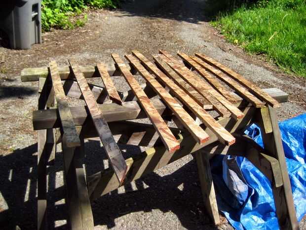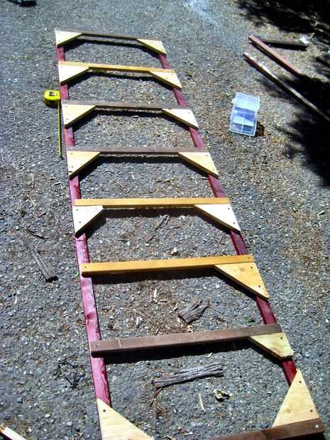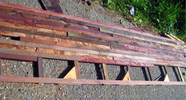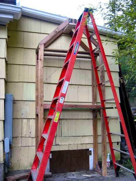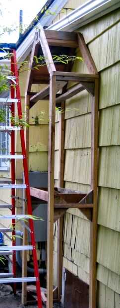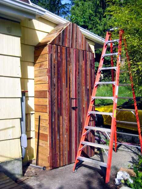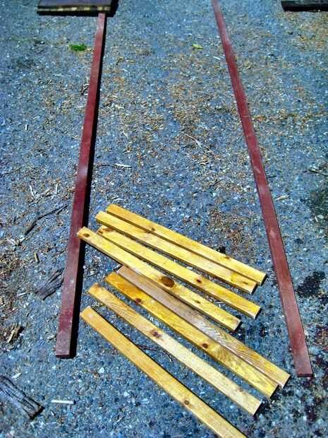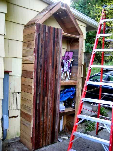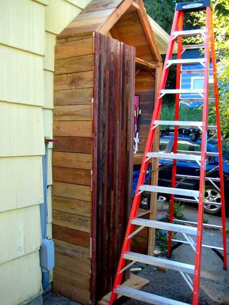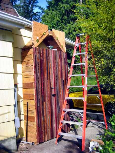 Esta está hecha enteramente de madera de desecho que tuve tumbado en una pila en la parte posterior de la yarda. El material para techos es reciclado de sobras cuando el techo fue hecho de nuevo hace un año. Incluyendo las uñas.