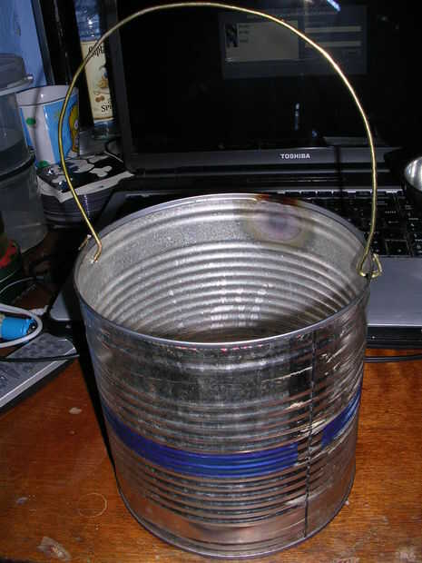 Latas más pequeñas también son útiles para hacer un pintores hervidor pintura con una caldera de pintura no es más que un bote pequeño de lata con un asa de alambre utilizado por los pintores para la celebración de pequeñas cantidades de pintura encima de una escalera u otro lugar donde todo el poder es torpe o pesada de llevar. . Una caldera de pintura generalmente cuesta alrededor de £5,00