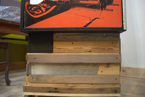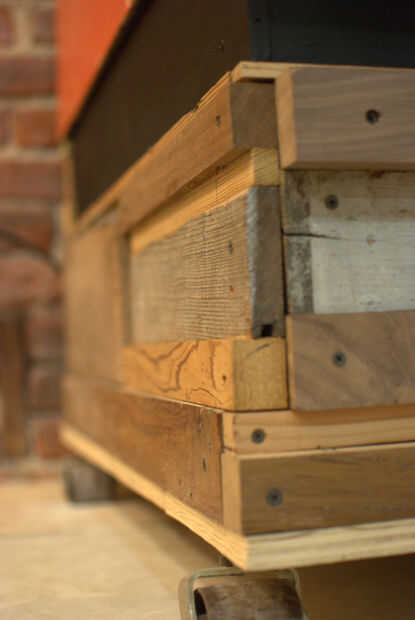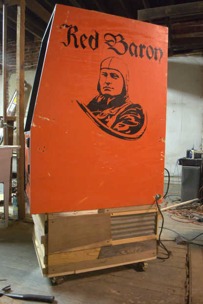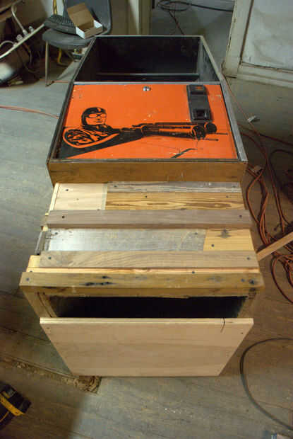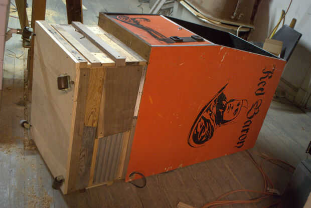 La base original del gabinete se hace de tablero de partícula que no era suficiente para soportar el peso nuevo que estaba añadiendo a la galería. Así que he decidido enmarcar la base con un surtido de trozos de madera duras, y más recuperado pisos de madera. La parte inferior de la base se enmarca con trozos de roble... roble será suficientemente fuerte como para instalar las ruedas en y soportar el peso del corpulento Barón rojo.