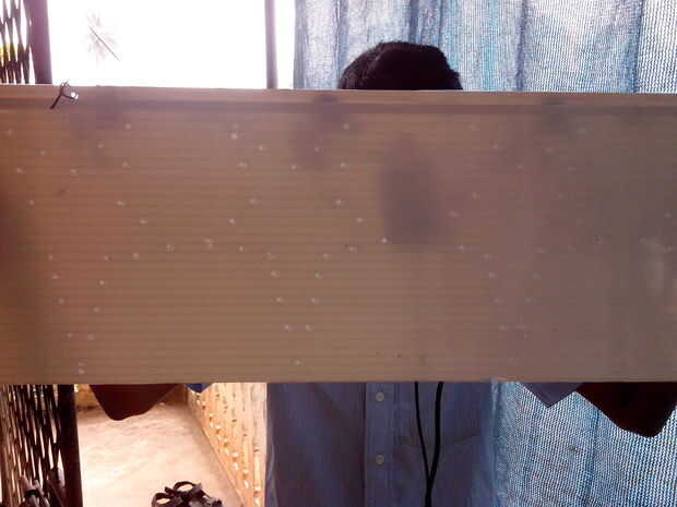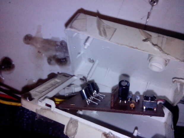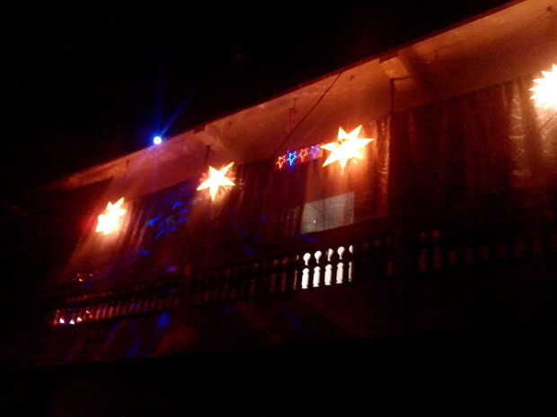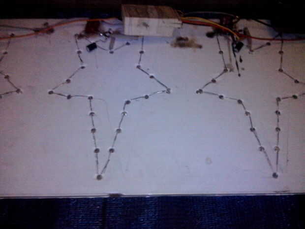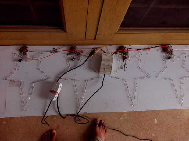 En este proyecto utilicé el mismo principio por parte del cazador, y en vez de bombilla incandescente utiliza 24 leds (de 1 estrella) y hecho estrellas en hoja de techo, como lo hizo 4 estrellas individuales en una hoja y conectado a la caja con los circuitos de convertidor.