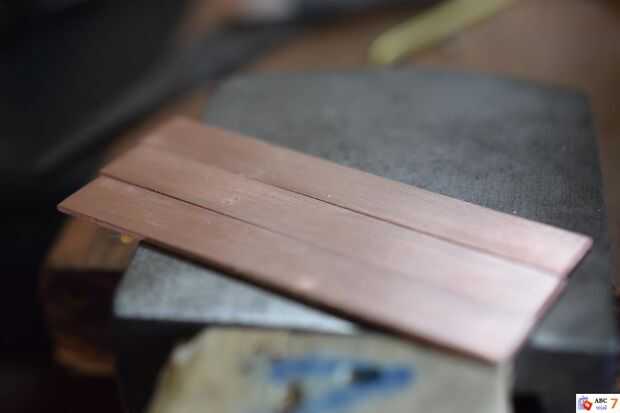 Se cortaron las tres tiras hacia fuera con un joyero vio voluntad soldar juntos para hacer una caña de anillo grueso, grueso.