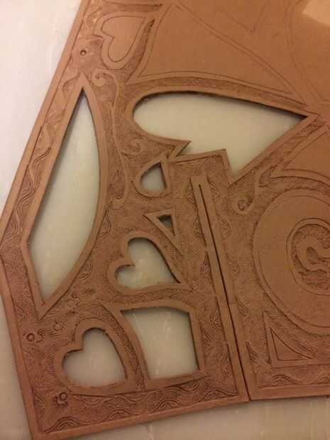 Después las herramientas, los espacios negativos se cortan con una combinación de un cuchillo del exacto para áreas pequeñas y un par de tijeras de cuero resistente para las líneas más largas.