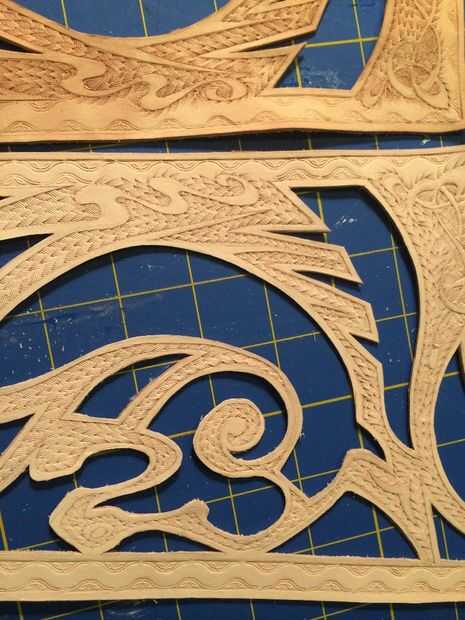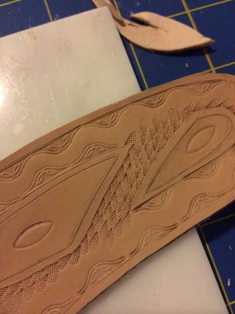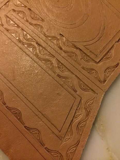 Hay tutoriales bastante completos en otras partes que explican el proceso de la herramienta, así que no entraré en mucho detalle aquí. En primer lugar, las líneas principales fueron cortadas con un cuchillo del exacto. Encajonar la piel frotándola con una esponja húmeda sobre él y sellado en el diseño de borde y fondo. La frontera utiliza un sello de frontera de diseño celta, y el fondo fue hecho con un sello de camuflaje en forma de pera pequeña.
