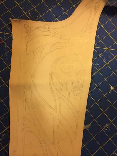 La forma más sencilla de transferir el diseño en este caso era simplemente cortar el patrón, incluyendo el enrejado, coloque sobre el cuero y traza con un lápiz. Por supuesto, cada pieza debía hacerse dos veces, una vez con el lápiz hacia arriba y otra vez con el lápiz hacia abajo, para crear dos piezas de imagen de espejo para cada una de las tres piezas.