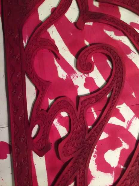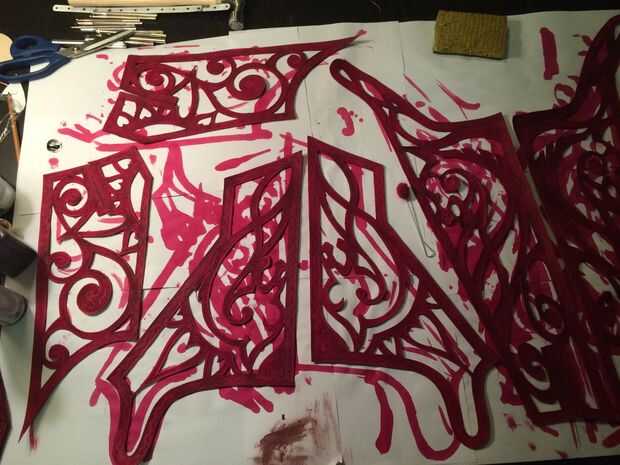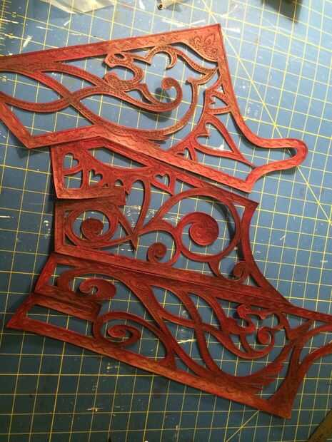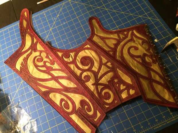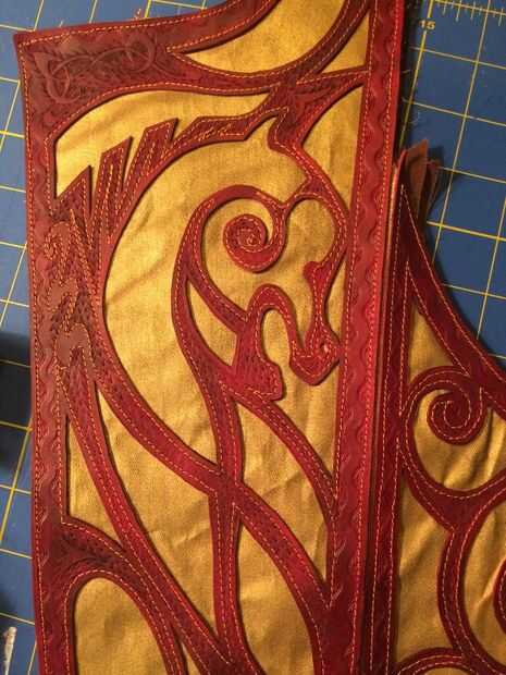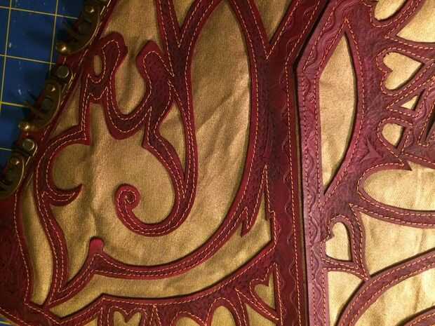 Luego cosió la piel en la capa exterior pintado de oro. Elegí un hilo de nylon de alta resistencia naranja, porque realmente quería esas puntadas para mostrar.