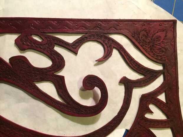 A continuación, había teñido de cuero (de Fiebing Oxblood) y pulir con una mancha de piel caoba, por lo que las herramientas se muestran muy bien.