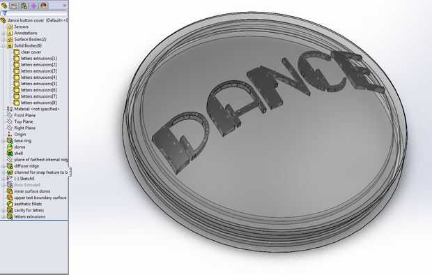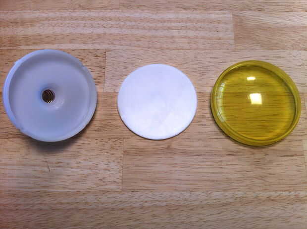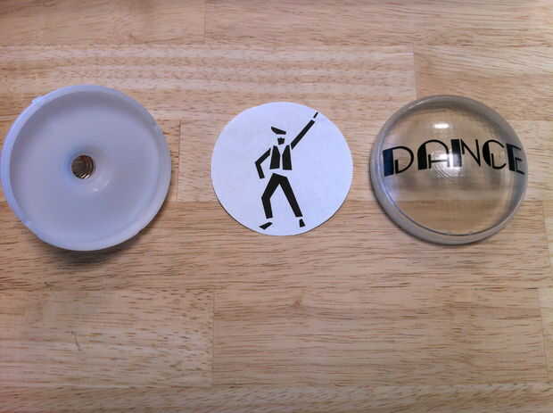 Mientras que el botón fue desmantelado, pensé que valía la pena añadir un pequeño toque extra. El Objet Connex 500 impresoras pueden imprimir materiales transparentes, así como imprimir con 2 materiales diferentes al mismo tiempo. Para probar esta funcionalidad, decidí reemplazar el botón amarillo domo con uno claro para trabajar mejor con mi LED RGB y me permiten imprimir en la cúpula de algún texto. También sustituye el difusor stock con un pedazo de papel con el baile de hombre.