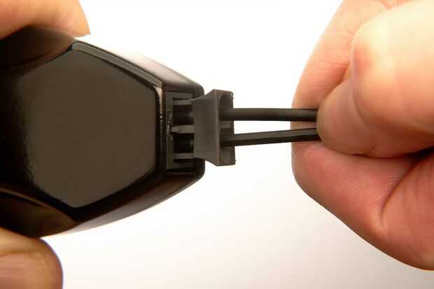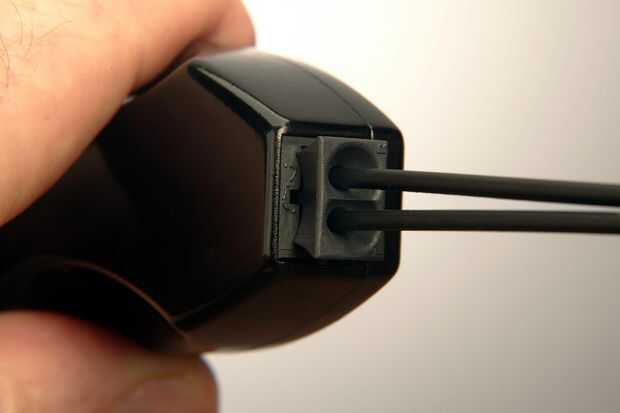 La única regla es que el final de la iluminación del par de cable POF debe ser insertado en el agujero oscuro (el lado del receptor de la llave) y empujó suavemente hasta la parte inferior de la toma. Los dongles puede permanecer siempre suministrado – tienen energía modo de ahorro si no se detecta ninguna conexión.