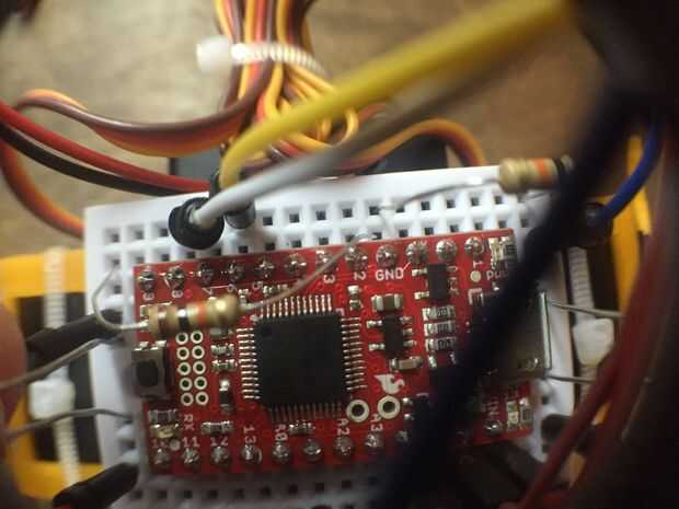 Los servo motores, el cable café se conecta una "tierra", y el rojo un "Vin". El cable de señal lo conectamos a los pines 6 y 8, como se muestra en la foto (los cables blanco y amarillo para servo izquierdo y derecho)