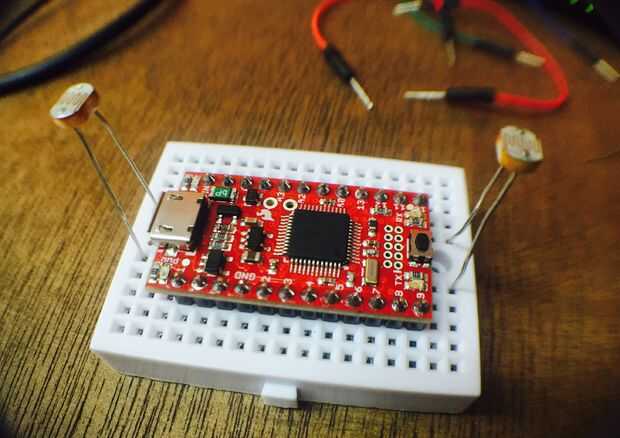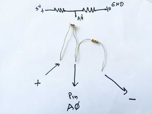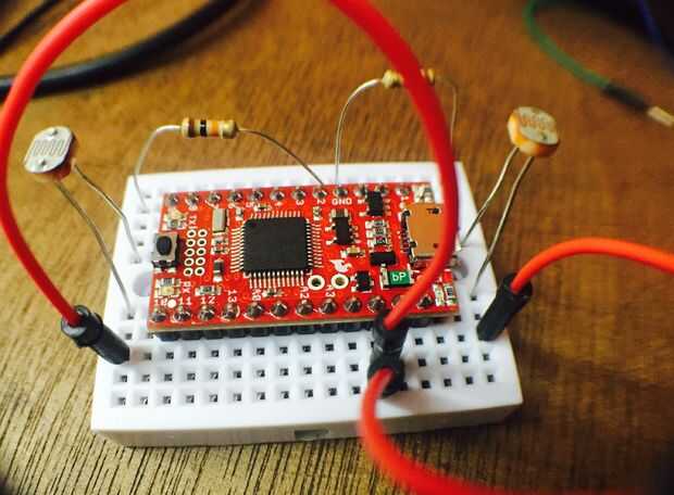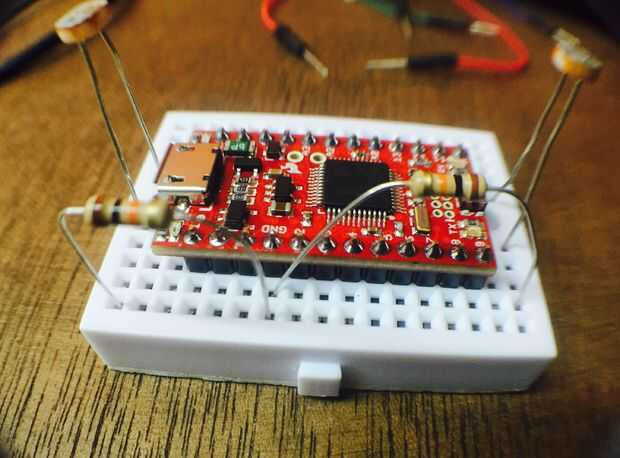 Los fotoresistores se conecta haciendo un divisor de voltaje. Como se muestra en la foto, se conecta el foto resistor de forma un lado va directo a el "VCC" de en SAMD21, y la otra va una de una de resistencia 10k Ohmn, y también a la entrada analógica "A0" (A1 y para el otro fotoresitor). En la foto se ve con cable verde y azul. La resistencia a su vez está conectada a "tierra". Sensor para de las Naciones Unidas de tener a cada lado, conectamos los fotoresistores como se muestra en la foto.