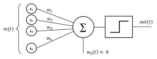 La función de activación out(t), es una función toma como valor suma, y entonces, Da como resultado -1 si w0(t) es menor que 0 Da como resultado + 1 si w0(t) es mayor o igual a 0.