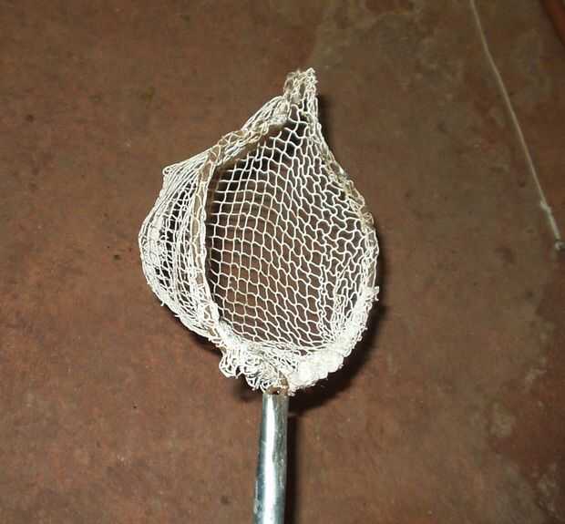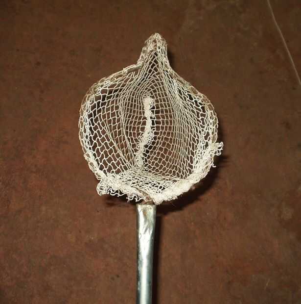 me gusta mallas para la bolsa porque es fuerte y transparente.   Si no tienes rejilla, siempre puede utilizar paño.  Que forma la bolsa depende de usted, dependiendo de la fruta que va a recoger.   En su mayoría látigo lo cosió a la varilla