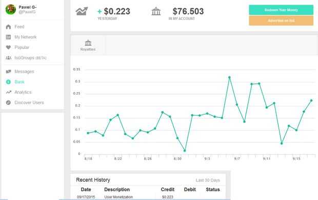 Se puede ver en la parte superior que actualmente me encuentro en $76,50 con $0,22 pagado en regalías el día antes. No puede parecer mucho pero es mucho más que obtener de Facebook o cualquier otra red social. Si eres activo en él sólo crecer y crecer. MUCHA gente (y no estoy hablando de celebridades, pero los usuarios en general) en la red ya hacen cientos de derechos de autor y tienen los cheques para probarlo.