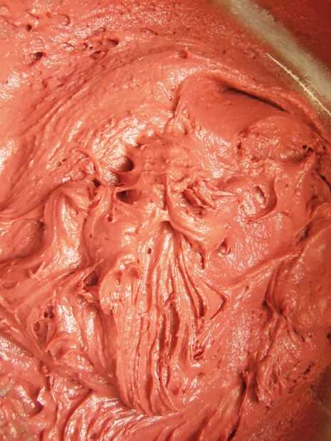 En el tazón de fuente de su mezclador eléctrico, equipado con el accesorio de paleta (también puede utilizar una batidora de mano), bate la mantequilla y el azúcar hasta ligero y mullido. Añadir el huevo batiendo bien. Golpe en el extracto de vainilla. En una pequeña taza, mezclar el suero de mantequilla y colorante rojo. Con la batidora a baja velocidad, alternativamente agregue la mezcla de suero de leche y mezcla de harina en tres adiciones, empezando y terminando con la harina. Colocar cucharadas soperas (también puede utilizar una bola de helado pequeña) de la mezcla sobre las hojas para hornear preparadas, espaciamiento de aproximadamente 2 pulgadas (5 cm) de distanciadas de amontonamiento. Con los dedos humedecidos o con el dorso de una cuchara, lisa la parte superior de las galletas.