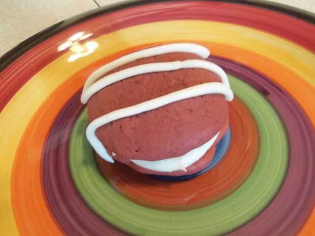 Montar: Tomar una galleta y propagación una cucharada llena del relleno sobre la parte plana de la cookie. Cubrir con otra galleta. Si lo desea, tomar un poco del relleno y delgada que fuera, consistencia de la tubería, con un poco de leche o crema. Coloque en una pequeña manga pastelera o bolsa de plástico y tuberías hacia adelante y hacia atrás sobre las copas de los Whoopie Pies. Pueden almacenar las cookies montadas, cubierto en el refrigerador por varios días.