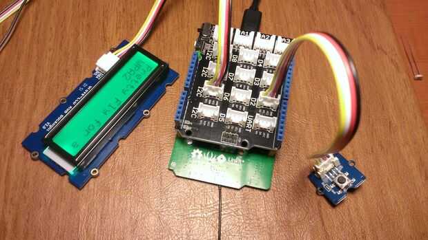 A continuación, asegúrese de que usted conecte el botón sensor en D2 y el RGB LCD en un puerto I2C. como se muestra en la foto de arriba.