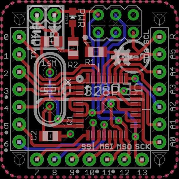 Diseñado para exprimir a los más pequeños de Proyectos donde el espacio es clave, pero tan potente como un UNO Arduino(TM) en el mismo chip. En el corazón su un tablero de arranque Atmega328p-AU con 0,1" espaciamiento, la más básica de apoyo circuitos y un puerto de isp para la programación. Esto le permite ser hackeable y adaptarse, poder con cualquier voltaje de 2.7-5.5V. (probablemente) sobrevivirá y seguir! cambiar el fusible bits! meterse con el reloj! luego cosas en una caja pequeña y ver que conducir su pequeño robot!