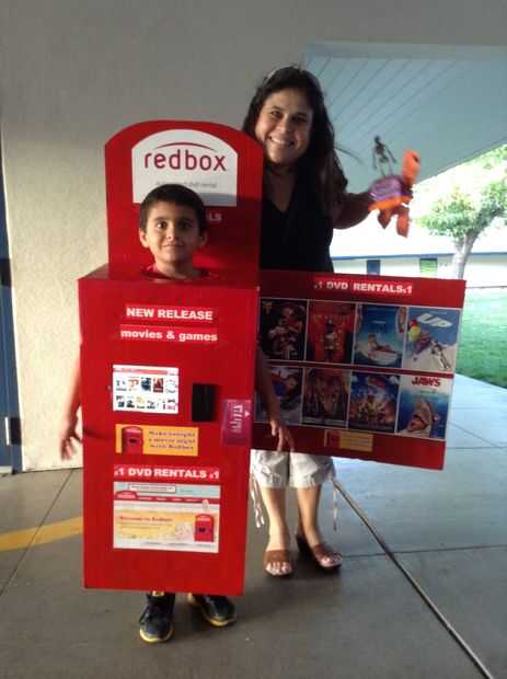 subiendo con un original disfraz para el concurso. Mientras conduce por una Red Box