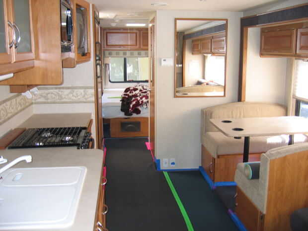 Comenzar cubriendo el suelo. Use varias capas de suelo - acolchado en la parte inferior, esponjoso en la parte superior. Use varias capas de modo que si se producen accidentes, basta con retirar una capa en lugar de otra que cubre el desastre. Utilice cinta adhesiva en sus tejidos, pero sólo utilice cinta de pintor mínimo a la RV paredes o pisos - los falsos paneles de madera pueden rasgar fácilmente apagado incluso si cuidado. Si tiene arranques, deja suelos las secciones untaped y disponibles para ser rodado para arriba o atrás hasta llegar en su ubicación permanente en la ciudad de Black Rock, o dondequiera que puede ser su destino final.