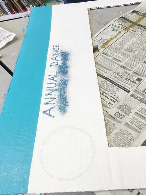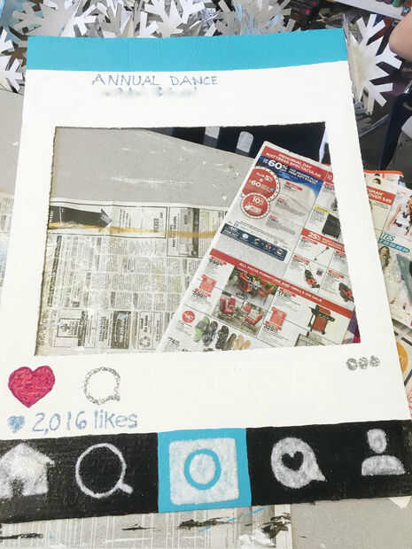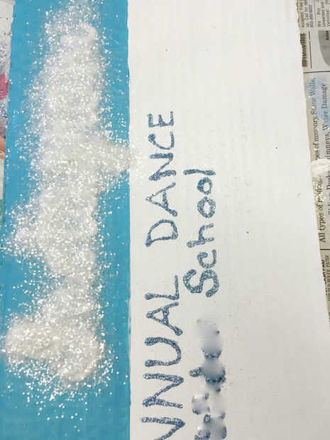 Hice lo mismo con las filas superiores. Me trazó el "Instagram" en lápiz y luego cubierto de pegamento y purpurina. Mi mano libre escribió el nombre del evento en pegamento y cubierto en brillo.