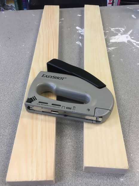 Usé algunas tiras de madera (alrededor de 2' de largo) de nuestro Departamento de mantenimiento para ayudar a la constante el marco como los lados estas básicamente en medio muy rápidamente en el proceso. También me dejan pedir prestado su engrapadora de trabajo pesado (no fotografiado) cuando mina (fotografiado) decidida romper conmigo.