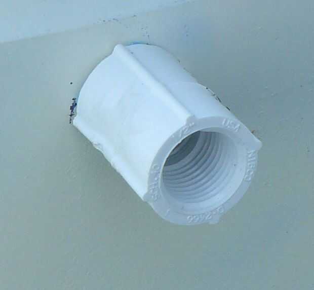 Que ahora desea insertar un trozo largo de tubo de PVC que le llevará a la parte posterior de la caseta. Era capaz de comprar una sección de 10 pies, pero a pesar de que la nave es 10 pies de ancho, no era suficiente porque fue a partir de aproximadamente un pie medio frente a la caseta y volviendo en ángulo. Simplemente podemos unir el tubo largo a uno corto con un conector recto es hembra sin rosca en ambos extremos. Esta longitud de tubería naturalmente se combará, por lo que tendrá que apoyar en algunos lugares a lo largo de su longitud. Hicimos esto atornillando parcialmente algunos tornillos de 3 pulgadas en el lado de la caseta en los lugares correctos.