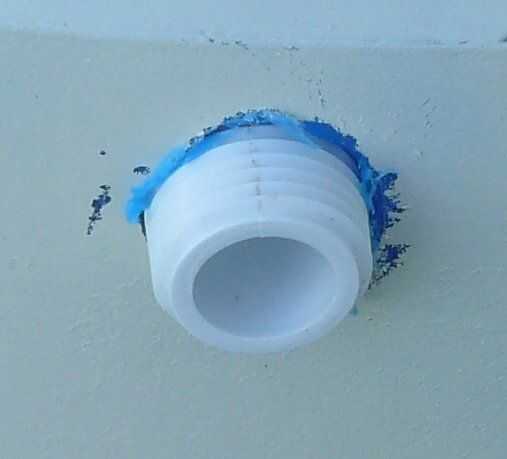 Inserte el extremo roscado macho de un conector de PVC que tiene un extremo hembra sin rosca. El extremo roscado se pegará el panel exterior. A esto Conecte un conector recto que es la hembra roscada en ambos extremos. Este apriete tanto como pueda. El agujero debe ser apenas el tamaño correcto para formar una conexión estanca pero quizá quieras enmasíllela. El agua que sale a través de ella no será bajo ninguna presión.