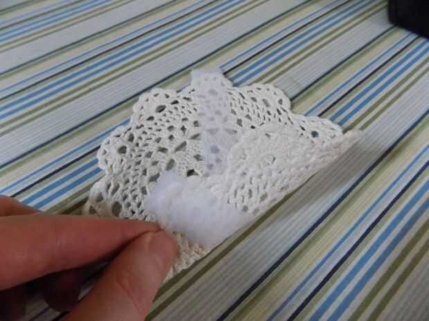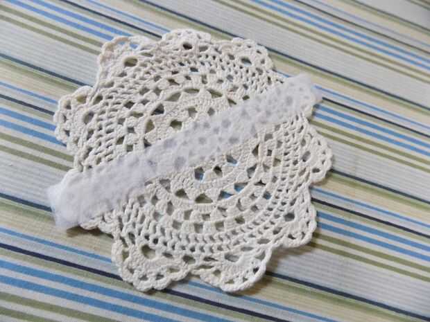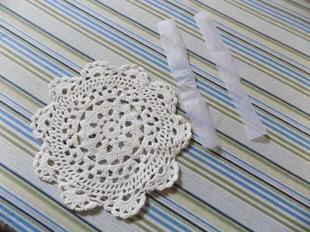 Cortar dos tiras de entretela cuya longitud es el diametro de su tapete. Deben ser de una 1/2" de grosor.