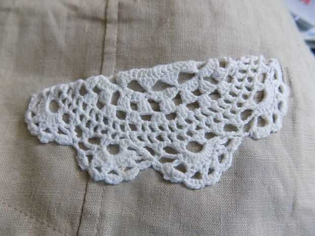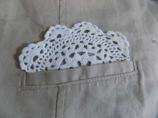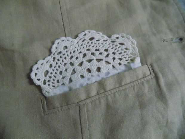 Con la primera mitad de la servilleta pequeña, doblar sobre el borde con la entretela y cosas en el bolsillo del chaleco.