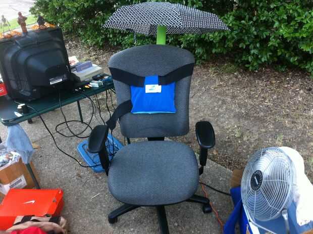 Silla basic de equipo rodante, con compresa fría atadas a la espalda y atado a la silla de paraguas... Obras grandes cuando mirando sobre ventas de yarda y tales.