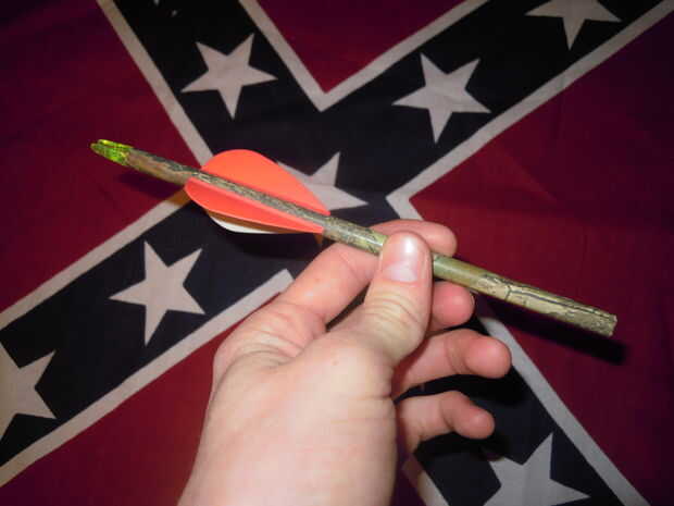 Comenzaremos hacer la pluma de la flecha. Es realmente bastante simple. Primero se corta la flecha hacia abajo la longitud que desee su pluma. Más plumas son cerca de 6" de largo, pero cortan la flecha lo que es más cómodo para usted. Una vez que se corta, se corta. Es mejor hacer más de lo que desea que más corto. Usted puede siempre hacer más corto si es necesario.