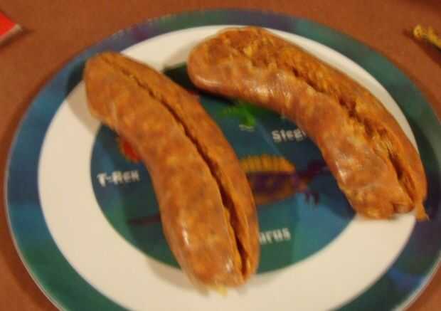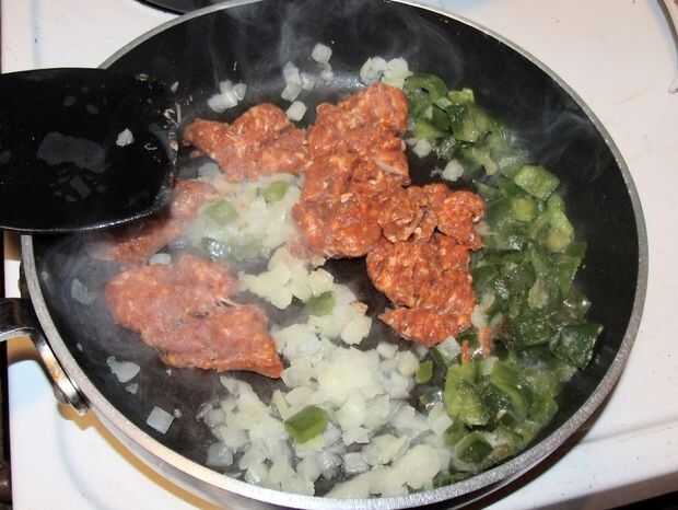 cortar la cubierta de salchicha 2 y añadir la carne a la sartén, ya que empieza a dorarse picarla en trozos pequeños