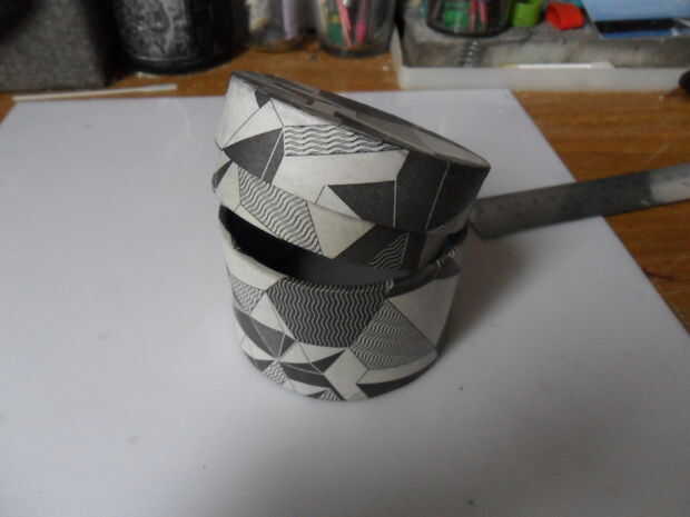 Una vez intenté hacer una caja redonda de cartón gris, y no salga bien. Para la cinta vacía pequeñas cajas centros y otros cilindros de cartón resulta más fácil.