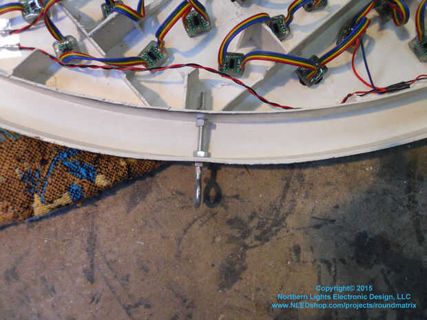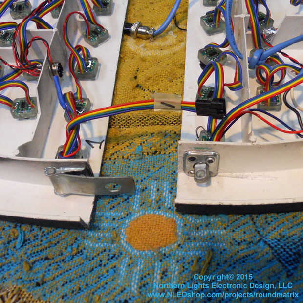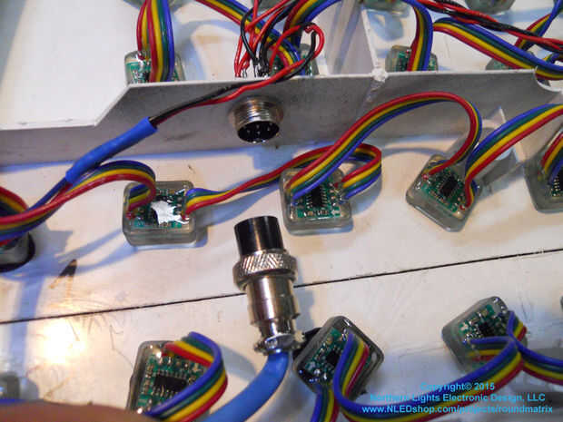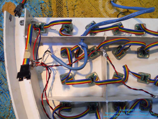 El filamento de pixel no puede llevar suficiente corriente para todos los píxeles en un filamento. Así múltiples "home runs" en lo posible, generalmente cada 25 píxeles un separado + 5v y GND del alambre se corrió a los conectores de alimentación. (Los cables rojo y negro) La matriz se ejecuta en 5 voltios y requiere 20A en el máximo drenaje. Algunos conectores corriente alta debían prever con seguridad que a la matriz. La matriz se divide por la mitad, cada mitad puede utilizarse por sí solo. Cada mitad tiene un conector hembra y una mitad tiene un hombre así. Permite tanto a conectarse entre sí, con una izquierda hembra para conectar a la fuente de alimentación. O cada mitad puede conectarse individualmente a una fuente de alimentación.