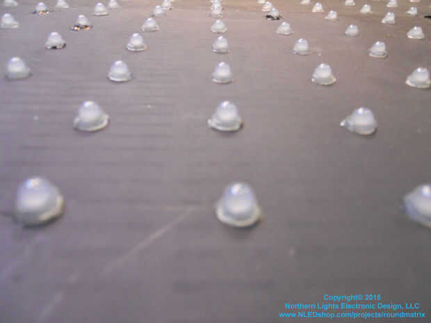 Una vez elegido el diseño LED, iniciar empujándolos a través de la parte posterior en el orden correcto. El taladro se deslizó o cortar algunos de los agujeros oblongos y en algunos lugares el substrato se rompió y se astilló. Mejor solución encontrada fue usar negro pegamento caliente redonda dentro del agujero antes de empujar el pixel a través y añadir algunas más de la parte delantera. Es sensible en la luz regular, ya que el pegamento es brillante, pero los pixeles pegados no miren diferentes cuando la matriz está en.