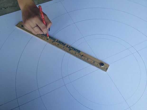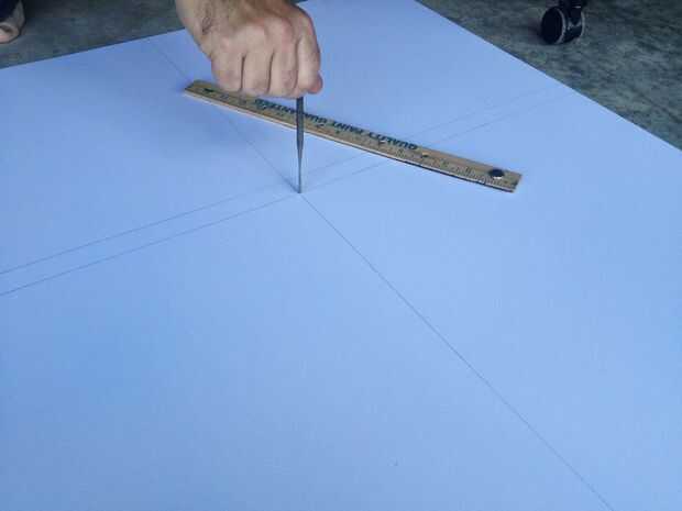 Antes que bajar la brújula en el tablero de lámina perimétrica la primera vez, medir la Junta sobre el borde corto y para poner una marquita en el punto medio. Luego se mide la distancia de esa marquita por la parte de registro de la Junta para que pueda crear un punto en el centro del tablero hacia un extremo. El punto aquí es dejar tanta chatarra en la parte inferior del tablero como sea posible.
