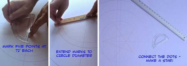 Esto puede sonar ridículo a los constructores reales por ahí, pero para hacer la estrella necesita un transportador. Algunos de ustedes son lo suficientemente inteligentes como para hacerlo con la brújula, pero no queremos que este proyecto para lavar a nadie que no dibujo de ingeniería en la escuela de comercio. Una estrella americana tiene 5 puntos, todos los puntos de la misma distancia unos de otros. Si nosotros estamos dibujando dentro de un círculo, significa que cada punto es 72° lejos de sus dos vecinos.
