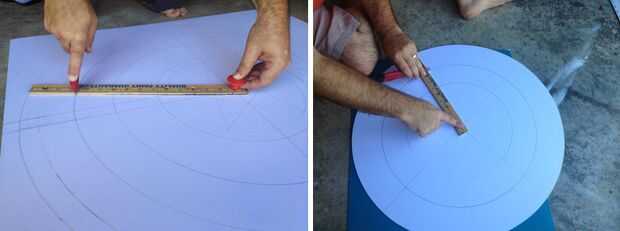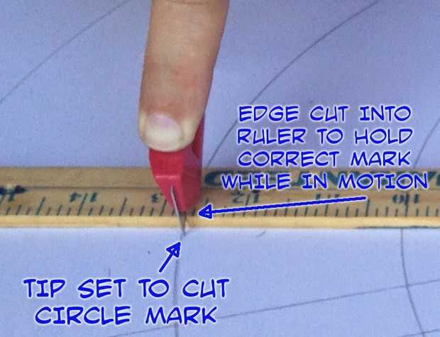 Ahora Asegúrese de que el centro de la brújula es ajustado correctamente y establecer su cuchillo en la marca de medida de la regla correspondiente a la marca de mayor radio en el tablero. Presione con firmeza para que pica a la punta de su cuchillo en el papel, y muerde el borde de la navaja en la regla de madera. Si se establece correctamente la hoja, simplemente puede tirar la hoja a lo largo de su marca de guía y la brújula le ayudará manteniendo el disco en el punto correcto en la circunferencia del círculo. Se puede ver en foto 1, arriba.