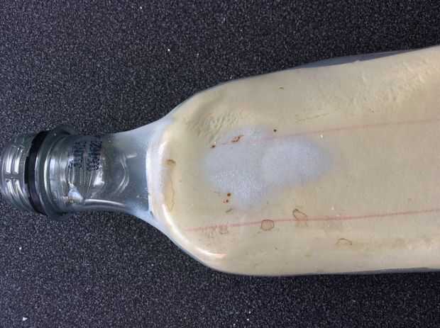 Calentar la botella pero no soplar calor en el mismo lugar. De lo contrario se hacen agujeros en la botella o conseguir algunos superficie ampollas (ver fotos).