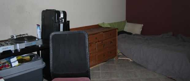 Ahora en esta esquina puse mi cama. Mi monitor de estudio izquierda está apuntando hacia la esquina donde está mi cama y la tela de mi cama es absorber el sonido que está muy bien. el monitor de estudio adecuado es entrar en la cocina rebotando y que difunde. Esto me da tratamiento acústico decente y aún me permite vivir en tal un un lugar pequeño.