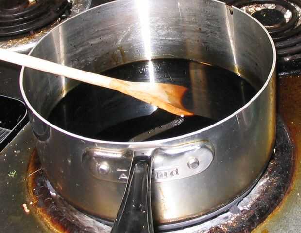 No quiero cocinar a fuego lento el vinagre, así que si ves burbujas gire hacia abajo. Lo que realmente quieres hacer es muy lentamente se evapora el agua sobrante para concentrar los sabores, por lo que esperan que esto continuará por una hora o dos dependiendo de su volumen.