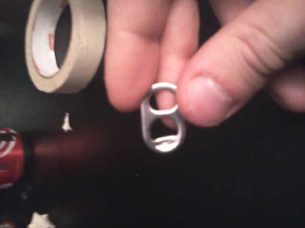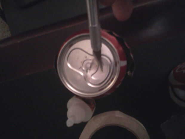 A continuación haz una perforación en el labio doblado abajo de la lata, la parte que entra al abrir la lata. Esta es la parte difícil. Es mucho más fácil/más seguro para doblar el borde hacia arriba y solamente use que otra ficha de otro puede, pero ahora que puede va a necesitar dos lengüetas.