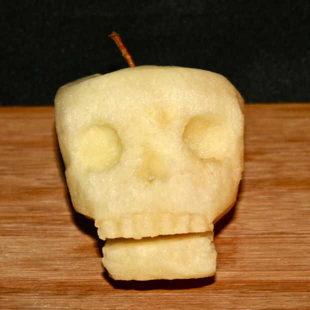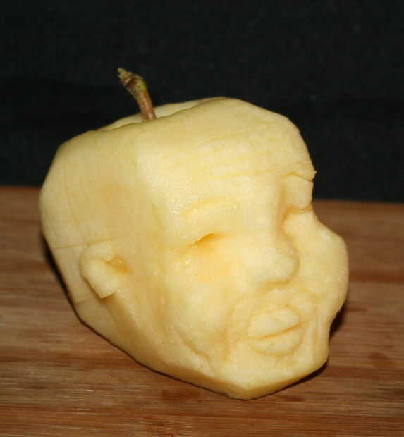 Utilice un cuchillo afilado (también puede usar palillos de dientes para rasguñar en detalles) para tallar una cara o un cráneo en su manzana. Elegí hacer una cabeza encogida, un cráneo y un mono. No te preocupes si tu talla no es perfecto, ya que las manzanas se marchitará y deformación de todas formas. Algunos detalles más pequeños se pueden perder pero otros va a ser pronunciados - sólo tendrás que esperar y ver.