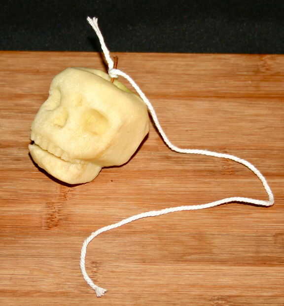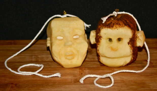 Fijar una cuerda a la madre de cada manzana y encontrar un lugar para colgarlos. Puede insertar clavos enteros secos ojos (o frijoles, etc.). Yo usa clavo de olor en polvo para obtener un mono dos tonos.