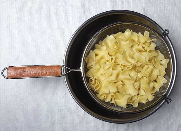 Unos 15 minutos antes de hace el pollo, hervir agua con sal. Añadir los fideos y cocinar hasta que la dente. Escurrir y apartar.