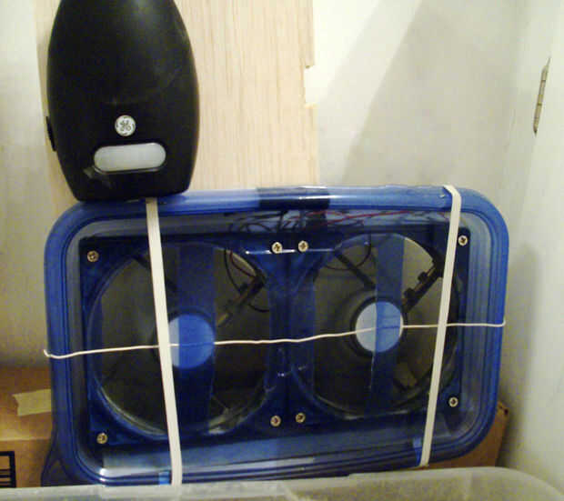 Tus fans para el interior de la tapa, asegurándose de que el flujo de aire va en la caja y que el cableado está situado cerca del orificio de salida del tornillo. Acople elástico en la parte superior de su tapa en el exterior, esto mantener el filtro en su lugar pero permitir la fácil remoción para su limpieza o reemplazo. Cortar un trozo de su filtro en la tapa y deslícela debajo del elástico.