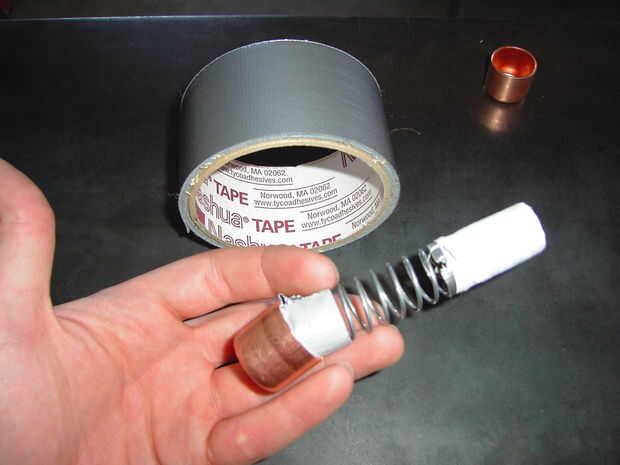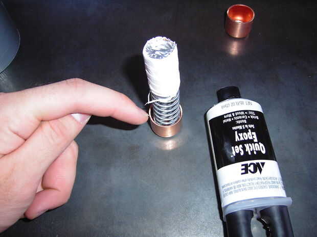 Después de que el resorte se fija en la tapa puede utilizar algunos epoxi para rellenar la parte inferior para hacer un agarre muy seguro. *(Remember to Sand The Surfaces of the Copper Before You use glue on it) *