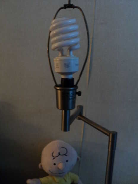 Hay un poco de tuerca o remate que tornillos abajo del marco de la pantalla a la pieza de arpa o de metal que soporta la pantalla alrededor del bulbo. El arpa puede quitar apretando juntos como un resorte y hacia afuera.