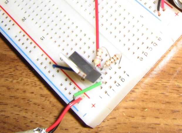 Si no has trabajado con un protoboard antes, pegar las piezas en los agujeros, y los agujeros están conectados entre sí en filas perpendiculares al eje longitudinal de la Junta.